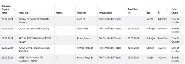 22 Ekim itibarıyla açıklanan listeye yeni firmalar eklenirken, denetimler sonucunda birçok üründe benzer hilelerin yapıldığı gözlemleniyor. Tarım ve Orman Bakanlığı, laboratuvar testleriyle sahtecilikleri tespit ederek tüketicileri uyarmaya devam ediyor. Et, zeytinyağı, bal, lahmacun, kebap ve sucuk gibi ürünler, sahtecilik vakalarının en çok görüldüğü ürün grupları arasında yer alıyor.