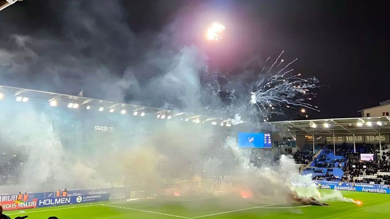 İlk maçı 3-0 kaybeden Norrköping'in sahasında oynanan rövanş mücadelesinde, takımlarının küme düşmesine tepki gösteren ev sahibi ekibin taraftarları 85. dakikada suni çim zemine yanıcı madde atmaya başladı.