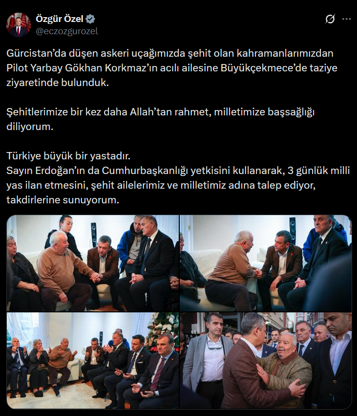 CHP Genel Başkanı Özgür Özel, Gürcistan’da düşen askeri uçakta şehit olan Pilot Yarbay Gökhan Korkmaz’ın ailesine Büyükçekmece’de taziye ziyaretinde bulundu. Ziyareti sonrası sosyal medya hesabında paylaşımda bulunan Özel, Türkiye’nin büyük bir yasa boğulduğunu belirterek, Cumhurbaşkanı Erdoğan’ın Cumhurbaşkanlığı yetkisini kullanarak 3 günlük milli yas ilan etmesini talep etti.