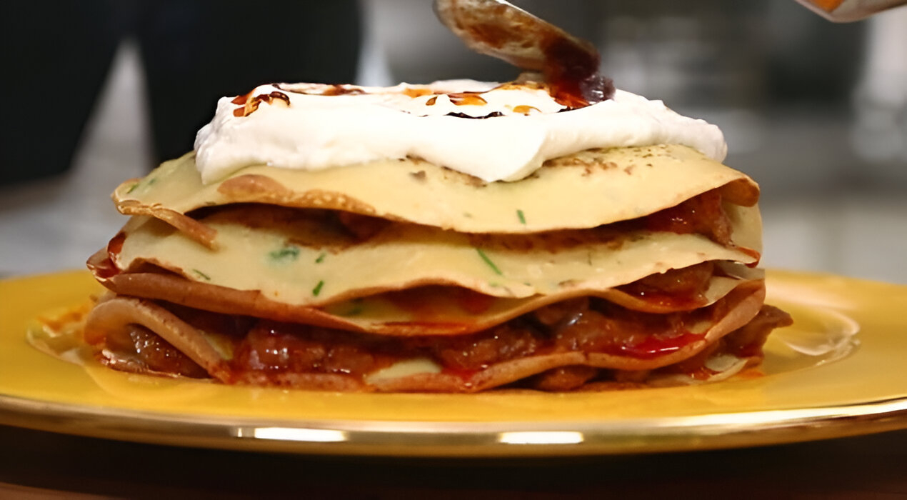 Zeytinyağı tencerede ısıtıldıktan sonra jülyen doğranmış kuzu eti eklenerek kavruluyor. Et suyunu çekince küp doğranmış soğan ilave ediliyor ve pembeleşene kadar pişiriliyor. Küp doğranmış domates ve salça eklenerek karıştırılıyor. Su ve baharatlar ilave edildikten sonra etler yumuşayana kadar pişiriliyor. Krepler için süt, yumurta, un ve maydanoz çırpılarak hamur hazırlanıyor. Isıtılan tavada ince krepler pişiriliyor. Servis tabağında bir krep ve bir kat etli harç olacak şekilde katlar oluşturuluyor. Üzeri yoğurtla kaplanıyor ve tereyağında kızdırılmış kırmızı biber yoğurdun üzerine gezdirilerek servis ediliyor.