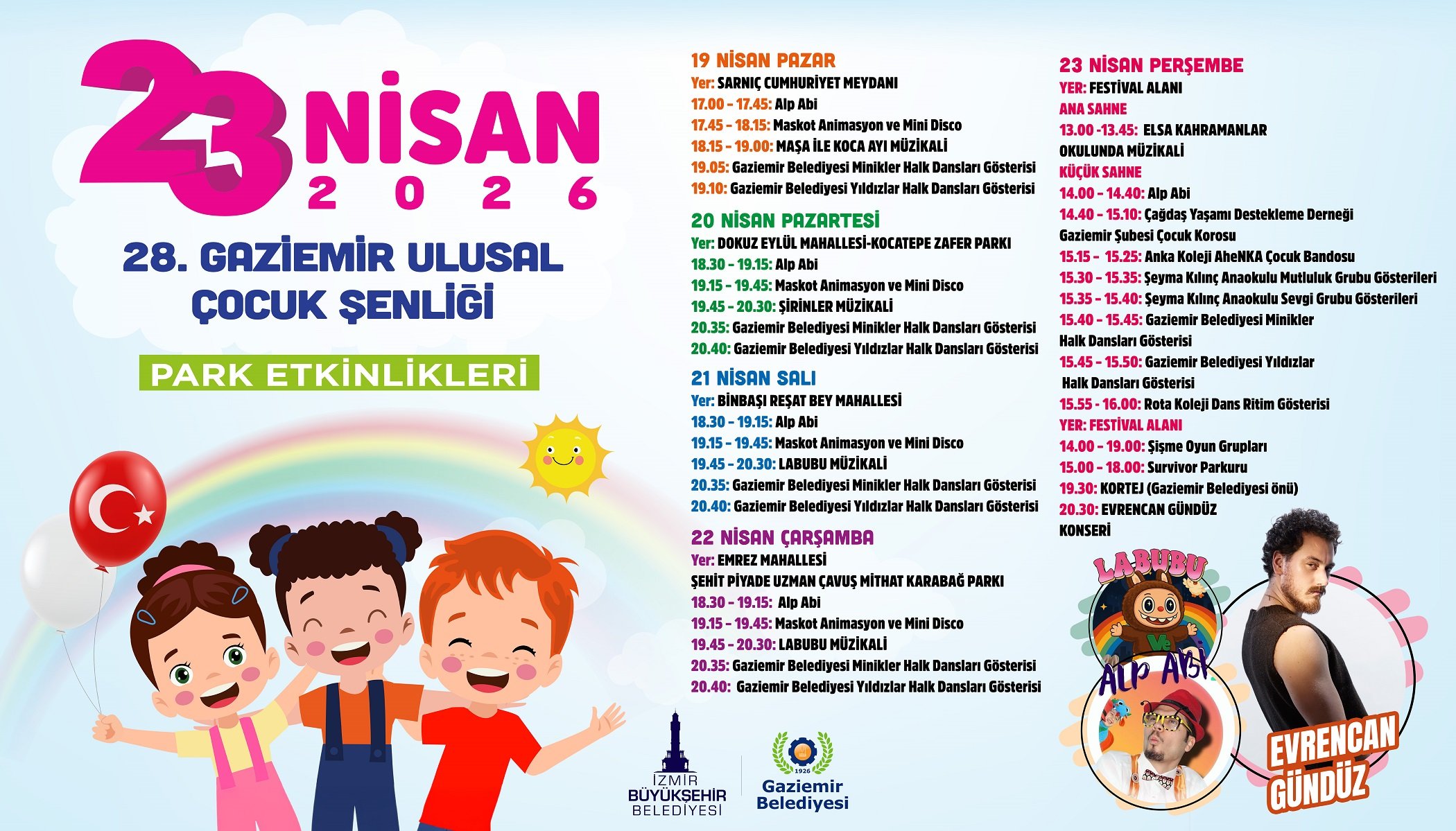 Gaziemir Belediyesi’nin 23 Nisan Ulusal Egemenlik ve Çocuk Bayramı kutlamaları kapsamında düzenleyeceği 28. Gaziemir Ulusal Çocuk Şenliği, birbirinden renkli etkinliklere ev sahipliği yapacak. 19-23 Nisan tarihleri arasında yapılacak şenlik kapsamında her gün ilçenin farklı bir bölgesinde çocuklar için etkinlikler düzenlenecek. Şenlik, 19 Nisan Pazar günü saat 17.00’de Sarnıç Cumhuriyet Meydanı’nda düzenlenecek programla başlayacak. 20 Nisan Pazartesi günü 9 Eylül Mahallesi Kocatepe Zafer Parkı’nda, 21 Nisan Salı günü Binbaşı Reşat Bey Mahallesi’nde ve 22 Nisan Çarşamba günü ise Emrez Mahallesi Şehit Piyade Uzman Çavuş Mithat Karabağ Parkı’nda gerçekleştirilecek etkinliklerle bayram coşkusu ilçenin dört bir yanına yayılacak.