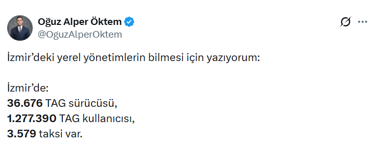 Yaşanan gelişmelerin ardından Öktem, sosyal medyadan paylaşım yaptı. Öktem, Türkiye genelinde paylaşımlı yolculuğa yönelik güçlü bir talep olduğunu vurgulayarak, “İzmir’deki yerel yönetimlerin bilmesi için yazıyorum: İzmir’de: 36.676 TAG sürücüsü, 1.277.390 TAG kullanıcısı, 3.579 taksi var." dedi.