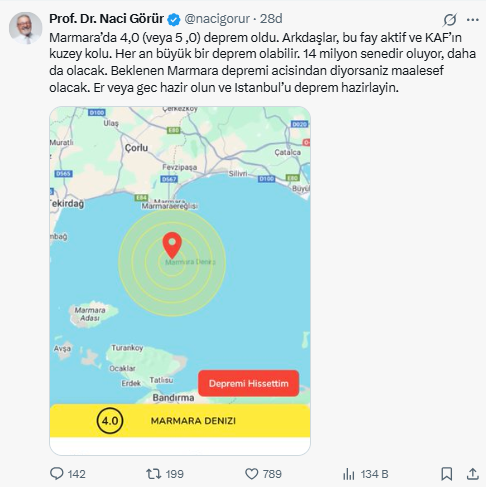 İzmir,İstanbul ve çevre illerden hissedilen depreme ilişkin sosyal medya hesabından açıklama yapan Görür İstanbul'u depreme hazırlayın dedi.