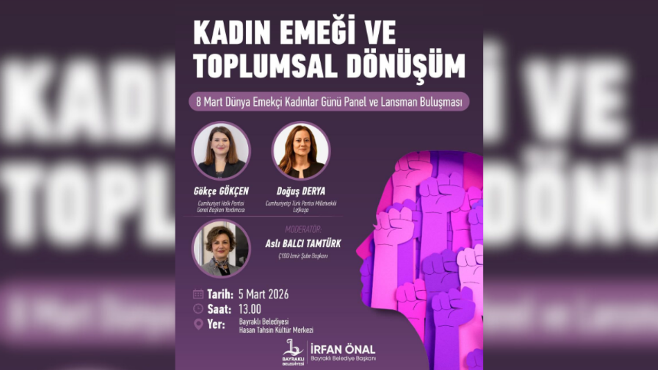 “Kadın Emeği ve Toplumsal Dönüşüm” başlıklı panel, 5 Mart perşembe günü saat 13.00'de Bayraklı Belediyesi Hasan Tahsin Kültür Merkezi'nde düzenlenecek.