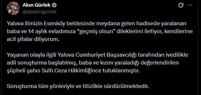 Gürlek açıklamasında, "Yalova ilimizin Esenköy beldesinde meydana gelen hadisede yaralanan baba ve 14 aylık evladımıza 'geçmiş olsun' dileklerimi iletiyor, kendilerine acil şifalar diliyorum. Yaşanan olayla ilgili Yalova Cumhuriyet Başsavcılığı tarafından ivedilikle adli soruşturma başlatılmış, baba ve kızını yaraladığı değerlendirilen şüpheli şahıs Sulh Ceza Hâkimliğince tutuklanmıştır. Soruşturma tüm yönleriyle ve titizlikle sürdürülmektedir" ifadelerini kullandı.