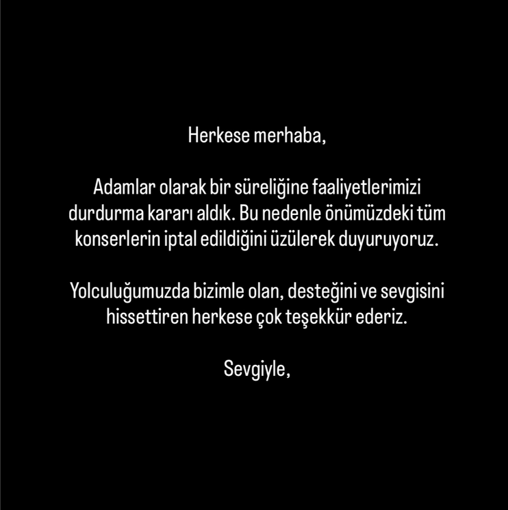 “Adamlar olarak bir süreliğine faaliyetlerimizi durdurma kararı aldık. Bu nedenle önümüzdeki tüm konserlerin iptal edildiğini üzülerek duyuruyoruz. Yolculuğumuzda bizimle olan, desteğini ve sevgisini hissettiren herkese çok teşekkür ederiz.”