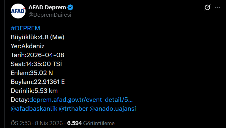 AFAD verilerine göre depremin verileri ise şöyle bildirildi: Büyüklük:4.8 (Mw) Yer:Akdeniz Tarih:2026-04-08 Saat:14:35:00 TSİ Enlem:35.02 N Boylam:22.91361 E Derinlik:5.53 km.