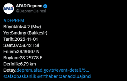 Afet ve Acil Durum Yönetimi Başkanlığı (AFAD), saat 07.58.42’de gerçekleşen depremin merkez üssünün Balıkesir’in Sındırgı ilçesi olduğunu bildirdi.