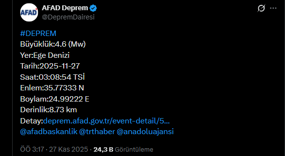 AFAD tarafından yapılan açıklamada, depremin saat 03.08’de kaydedildiği ve büyüklüğünün 4.6 olduğu belirtildi. Depremin 8.73 kilometre derinlikte meydana geldiği açıklandı.