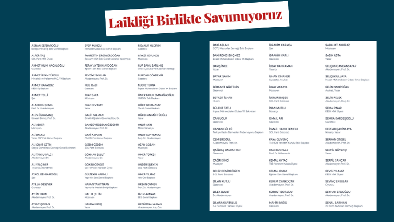 Aralarında akademisyen, yazar, siyasetçi, sanatçı, gazeteci, meslek odası temsilcilerinin de bulunduğu 168 isim, kaleme aldıkları ortak bir bildiriyle laikliği savunmak için harekete geçti.