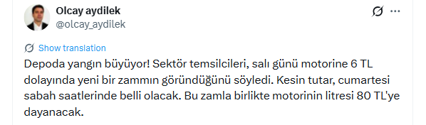 Gazeteci Olcay Aydilek’in sosyal medya hesabı üzerinden aktardığı sektör temsilcilerinden edinilen bilgilere göre motorin fiyatlarında salı günü itibarıyla yaklaşık 6 TL seviyesinde bir artış gündeme gelebilir.