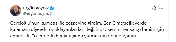 Tutukluluğunun ardından sosyal medya hesabı aracılığıyla dikkat çeken bir mesaj paylaşan Ergün Poyraz, şu ifadeleri aktardı: "Çerçioğlu’nun kumpası ile cezaevine girdim. Ben 6 metrelik yerde kalamam diyerek topuklayanlardan değilim. Ülkemin her karışı benim için cennettir. O cennetin her karışında yatmaktan onur duyarım."