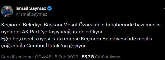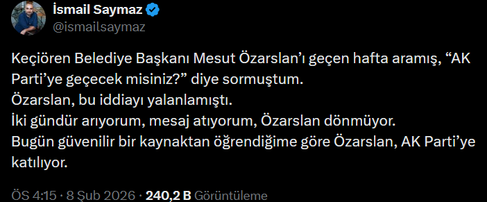 CHP’li Keçiören Belediye Başkanı Mesut Özarslan’ın AKP’ye geçeceği yönündeki iddialar siyaset kulislerinde konuşulmaya devam ediyor. Gazeteci İsmail Saymaz, “güvenilir bir kaynaktan” edindiği bilgiyi paylaşarak, Özarslan’ın AKP’ye geçme hazırlığında olduğunu öne sürdü. Saymaz’ın aktardığına göre, Özarslan’ın bazı belediye meclis üyeleriyle birlikte AKP’ye katılabileceği ifade ediliyor. Beş meclis üyesinin istifa etmesi halinde Keçiören Belediye Meclisi’nde çoğunluğun Cumhur İttifakı’na geçeceği belirtiliyor.