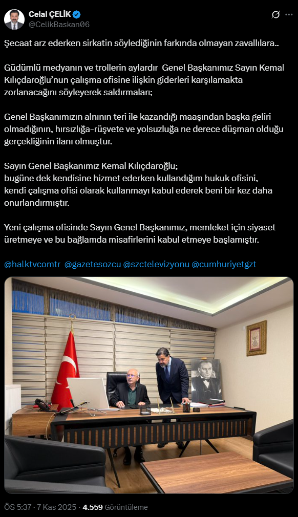 "Şecaat arz ederken sirkatin söylediğinin farkında olmayan zavallılara.. Güdümlü medyanın ve trollerin aylardır Genel Başkanımız Sayın Kemal Kılıçdaroğlu’nun çalışma ofisine ilişkin giderleri karşılamakta zorlanacağını söyleyerek saldırmaları; Genel Başkanımızın alnının teri ile kazandığı maaşından başka geliri olmadığının, hırsızlığa-rüşvete ve yolsuzluğa ne derece düşman olduğu gerçekliğinin ilanı olmuştur. Sayın Genel Başkanımız Kemal Kılıçdaroğlu; bugüne dek kendisine hizmet ederken kullandığım hukuk ofisini, kendi çalışma ofisi olarak kullanmayı kabul ederek beni bir kez daha onurlandırmıştır. Yeni çalışma ofisinde Sayın Genel Başkanımız, memleket için siyaset üretmeye ve bu bağlamda misafirlerini kabul etmeye başlamıştır."