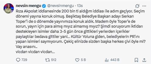Öte yandan Mengü'nün, "Madem öyle Toper’e de sorun, yayın için para almış mıyız almamış mıyız?" ifadesi üzerine eski MHP Beşiktaş Belediye Başkan Adayı Serkan Toper'de açıklama yaptı.
