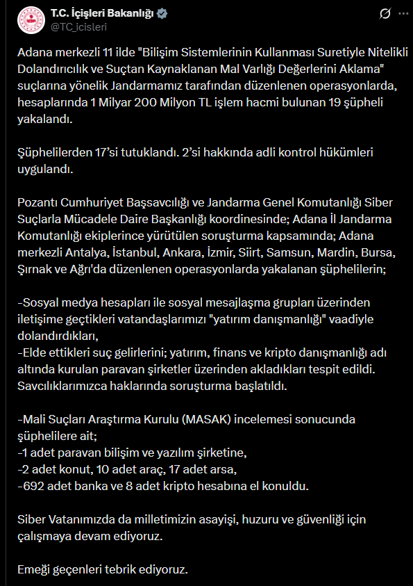 "Adana merkezli 11 ilde 'bilişim sistemlerinin kullanılması suretiyle nitelikli dolandırıcılık ve suçtan kaynaklanan mal varlığı değerlerini aklama' suçlarına yönelik Jandarmamız tarafından düzenlenen operasyonlarda, hesaplarında 1 milyar 200 milyon TL işlem hacmi bulunan 19 şüpheli yakalandı. Şüphelilerden 17’si tutuklandı. 2’si hakkında adli kontrol hükümleri uygulandı.