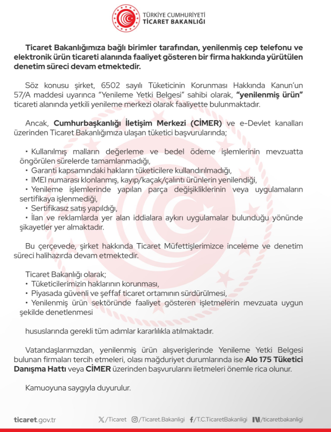Ticaret Bakanlığı, yenilenmiş cep telefonu ve elektronik ürün satışı yapan bir firma hakkında CİMER ve e-Devlet üzerinden gelen yoğun şikayetler üzerine inceleme ve denetim süreci başlattığını açıkladı. Aynı zamanda Ticaret Bakanlığı, yenilenmiş cep telefonu alacak vatandaşlara kritik uyarıda bulundu.