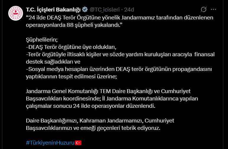 “"24 ilde DEAŞ terör Örgütüne yönelik düzenlenen operasyonlarda 88 şüpheli yakalandı." Jandarma Genel Komutanlığı Terörle Mücadele Daire Başkanlığı ve Cumhuriyet Başsavcılıkları koordinesinde, İl Jandarma Komutanlıklarınca DEAŞ Terör Örgütüne yönelik 24 ilde operasyonlar düzenlendi.