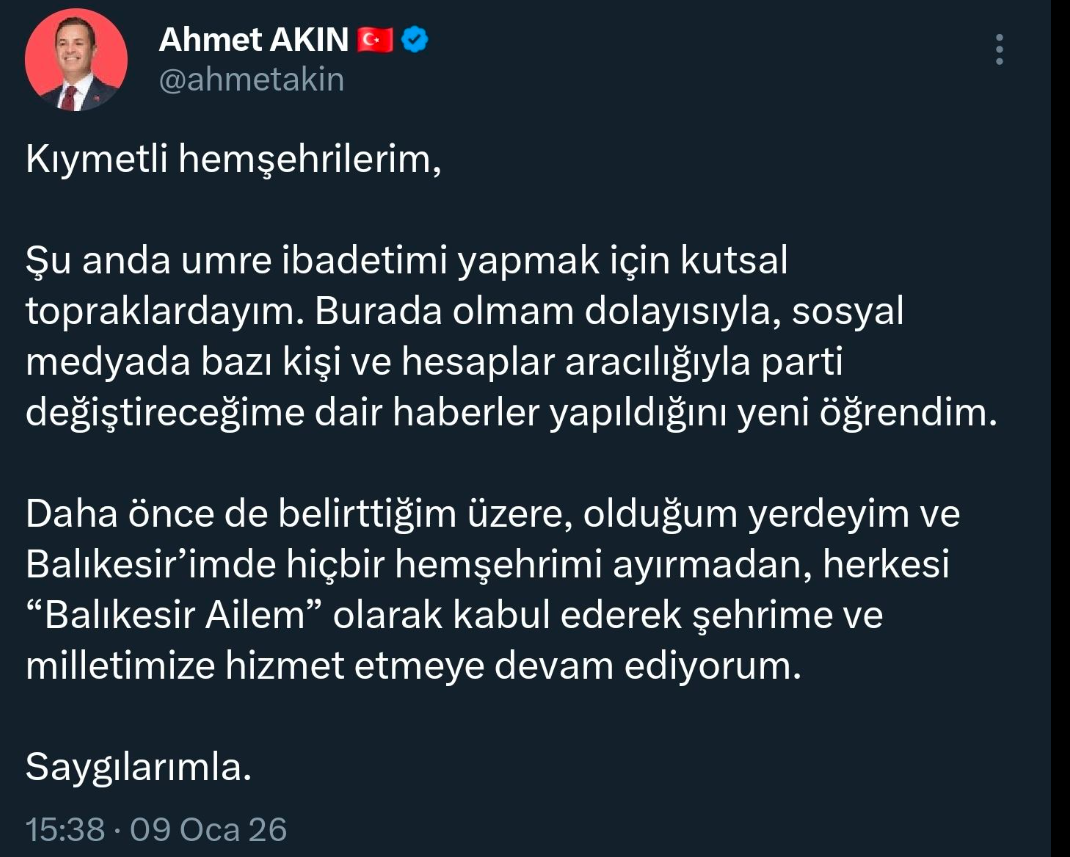 CHP’li Balıkesir Büyükşehir Belediye Başkanı Ahmet Akın, umre ziyareti sırasında sosyal medya hesabından yaptığı açıklamada parti değiştireceğine yönelik iddialara yanıt verdi. Ahmet Akın, X sosyal medya hesabı üzerinden konuya ilişkin şu açıklamayı aktardı: “Kıymetli hemşehrilerim, Şu anda umre ibadetimi yapmak için kutsal topraklardayım. Burada olmam dolayısıyla, sosyal medyada bazı kişi ve hesaplar aracılığıyla parti değiştireceğime dair haberler yapıldığını yeni öğrendim. Daha önce de belirttiğim üzere, olduğum yerdeyim ve Balıkesir’imde hiçbir hemşehrimi ayırmadan, herkesi “Balıkesir Ailem” olarak kabul ederek şehrime ve milletimize hizmet etmeye devam ediyorum. Saygılarımla.”