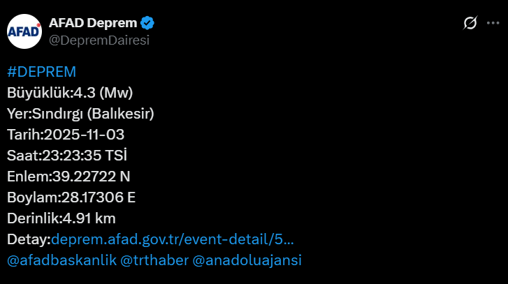 Afet ve Acil Durum Yönetimi Başkanlığı (AFAD) verilerine göre, saat 23:23’te Balıkesir’in Sındırgı ilçesinde 4,3 büyüklüğünde bir deprem meydana geldi. Depremin yerin yaklaşık 4,91 kilometre derinliğinde kaydedildiği bildirildi. Sarsıntı, özellikle merkez üssüne yakın bölgelerde hissedilirken, çevre ilçelerden de duyulduğu aktarıldı. İlk bilgilere göre can kaybı ya da ciddi bir hasar yaşanmadığı belirtiliyor.