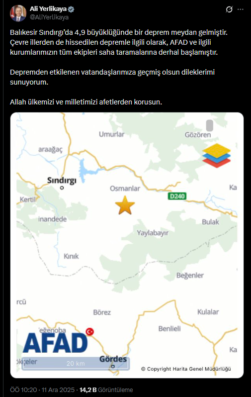 Balıkesir’in Sındırgı ilçesinde 4,9 büyüklüğünde bir deprem meydana geldi. Çevre illerde de hissedilen sarsıntının ardından İçişleri Bakanı Ali Yerlikaya sosyal medya hesabı üzerinden önemli biraçıklama yaptı.