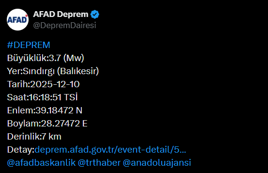 Balıkesir’in Sındırgı ilçesinde saat 16.18’de 3.7 büyüklüğünde deprem meydana geldi. AFAD, depremin yerini ve derinliğini resmi verilerle açıkladı.