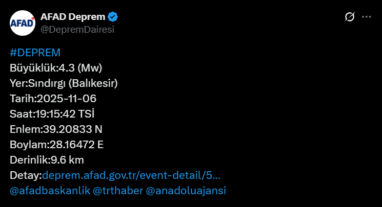 Afet ve Acil Durum Yönetimi Başkanlığının (AFAD) internet sitesinde yer alan bilgiye göre, saat 19,15'te merkez üssü Balıkesir’in Sındırgı ilçesi olan 4,3 büyüklüğünde bir deprem kaydedildi.
