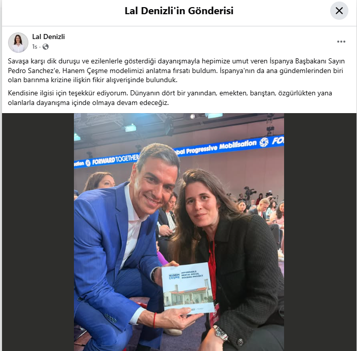 Zirveye katılan isimler arasında yer alan Çeşme Belediye Başkanı Lal Denizli, toplantı sonrası İspanya Başbakanı Pedro Sánchez ile birebir görüşme gerçekleştirdi. Görüşmede, yerel yönetim politikaları ve özellikle barınma krizi ana gündem maddeleri arasında yer aldı. Çeşme Belediye Başkanı Lal Denizli, görüşmede Çeşme’de uygulanan Hanem Çeşme modelini Sánchez’e tanıttı.