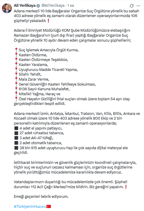İçişleri Bakanı Ali Yerlikaya, sosyal medya hesabından yaptığı açıklamada, içlerinde İzmir'in de bulunduğu Adana merkezli 10 ilde Bayğaralar organize suç örgütüne yönelik bu sabah 403 adrese yönelik eş zamanlı düzenlenen operasyonlarda 106 şüpheliyi yakaladıklarını" duyurdu.