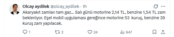 Dün gece yarısından itibaren motorine 1,14 TL, benzine 55 kuruş zam yapılmıştı. Gazeteci Olcak Aydilek’in aktardığı bilgilere göre yeni zam 10 Mart 2026 Salı günü uygulanacak. Aydilek, akaryakıta beklenen zam haberini sosyal medya hesabı üzerinden şu ifadelerle paylaştı: "Akaryakıt zamları tam gaz... Salı günü motorine 2,14 TL, benzine 1,54 TL zam bekleniyor. Eşel mobil uygulaması gereğince motorine 53 kuruş, benzine 39 kuruş zam yapılacak."