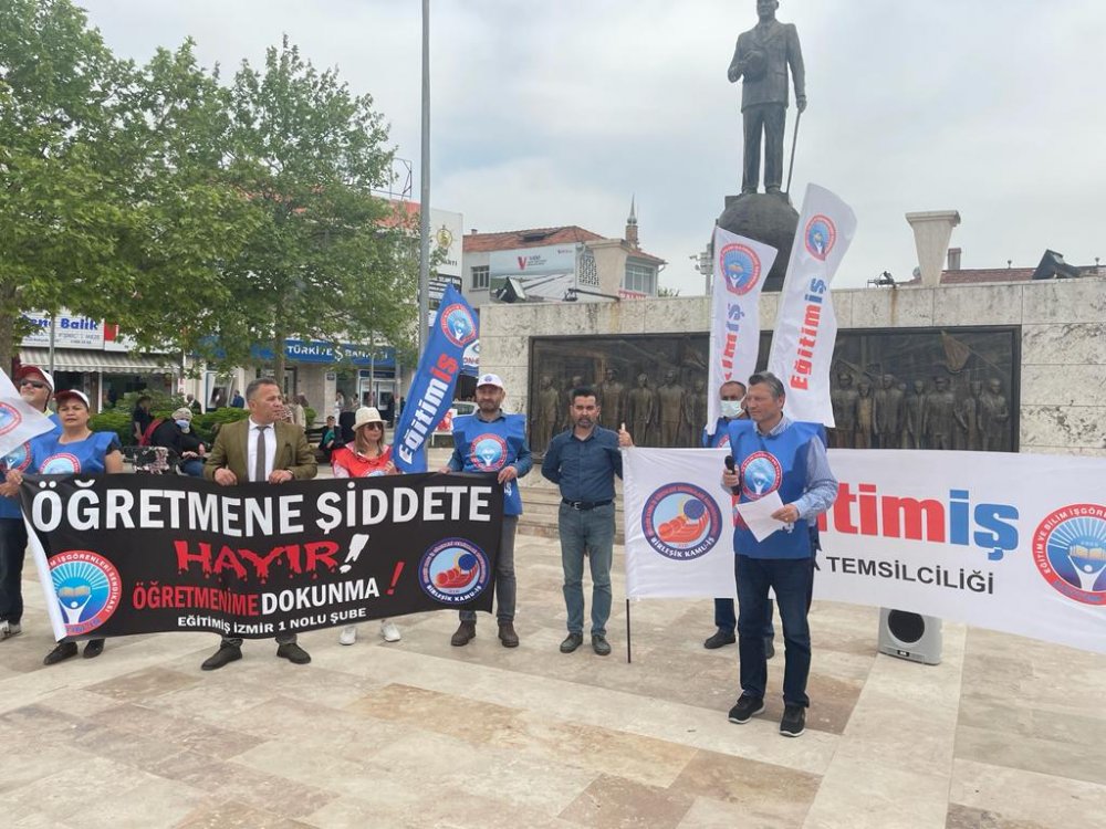 Yapılan açıklamada, "Eğitim çalışanlarımıza yapılan saldırıları şiddetle kınıyoruz. Eğitim çalışanlarımızın yaşadığı bu olayların sorumlusu, sendikamızın tüm eleştiri ve uyarılarına rağmen eğitimde yaşanan sorunlara ve şiddet olaylarına seyirci kalan, öğretmenlik mesleğini itibarsızlaştıranlardır. Okullarımızda güvenlik personeli yok ve bu ihtiyaç karşılanmıyor. Okul idarecilerimiz, zor koşullarda üstlerine sorun aktarmamak adına görev yapmaya çalışmaktadırlar. Çünkü biliyoruz ki okullara ödenek yollanmıyor, okul aile birlikleri bağış topluyor, veli şikayet ediyor ve yine soruşturmaya uğrayan öğretmen ve idareciler oluyor. Mesleğimizi sağlıklı, güvenli ve mesleki onurumuza yakışır bir şekilde icra edebilmemiz için biz eğitim çalışanlarına acilen kulak verilmelidir. Okullarda şiddetin son bulması için acilen gerekli adımlar atılmalı, hiç kimse şiddetin uygulayıcısı ya da hedefi haline getirilmemelidir. Bu konuda somut ve kalıcı çözümler üretilmesi ve okullarda yaşanan şiddetin önlenmesi için başta Milli Eğitim Bakanlığı ve İzmir İl Milli Eğitim Müdürlüğü olmak üzere bütün yetkilileri acilen harekete geçmeye çağırıyoruz" ifadeleri kullanıldı.