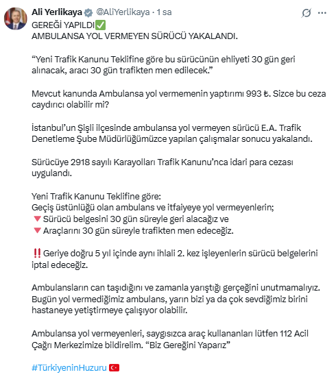 İçişleri Bakanı Ali Yerlikaya, sosyal medya hesabı üzerinden yaptığı paylaşımda, İstanbul’un Şişli ilçesinde ambulansa yol vermeyen sürücü E.A.'nın Trafik Denetleme Şube Müdürlüğü'nce yakalandığını açıkladı. Yeni Trafik Kanunu Teklifi'yle getirilen cezalarla ilgili bilgi veren Yerlikaya'nın paylaşımı şöyle: