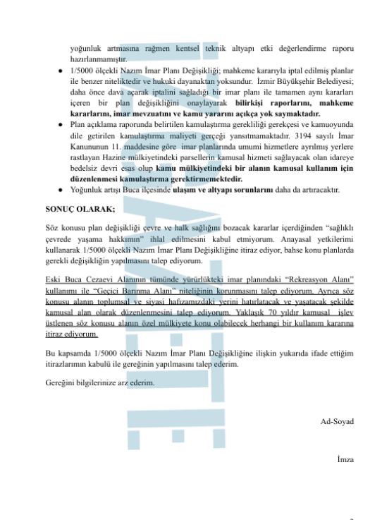 İzmir Büyükşehir Belediyesi; daha önce dava açarak iptalini sağladığı bir imar planı değişikliğini onaylayarak bilirkişi raporlarını, mahkeme kararlarını, imar mevzuatını ve kamu yararını açıkça yok saymaktadır. Söz konusu plan; bilirkişi raporunda vurgulanan hususları dikkate almamakta olup hukuki mücadelemiz sonucunda iptal edilmiş planlarla birebir aynı niteliktedir ve hukuka aykırıdır
