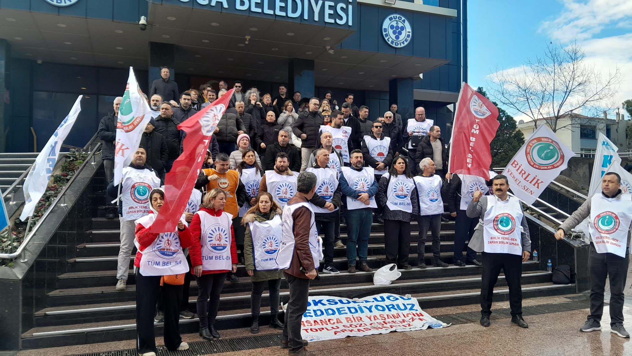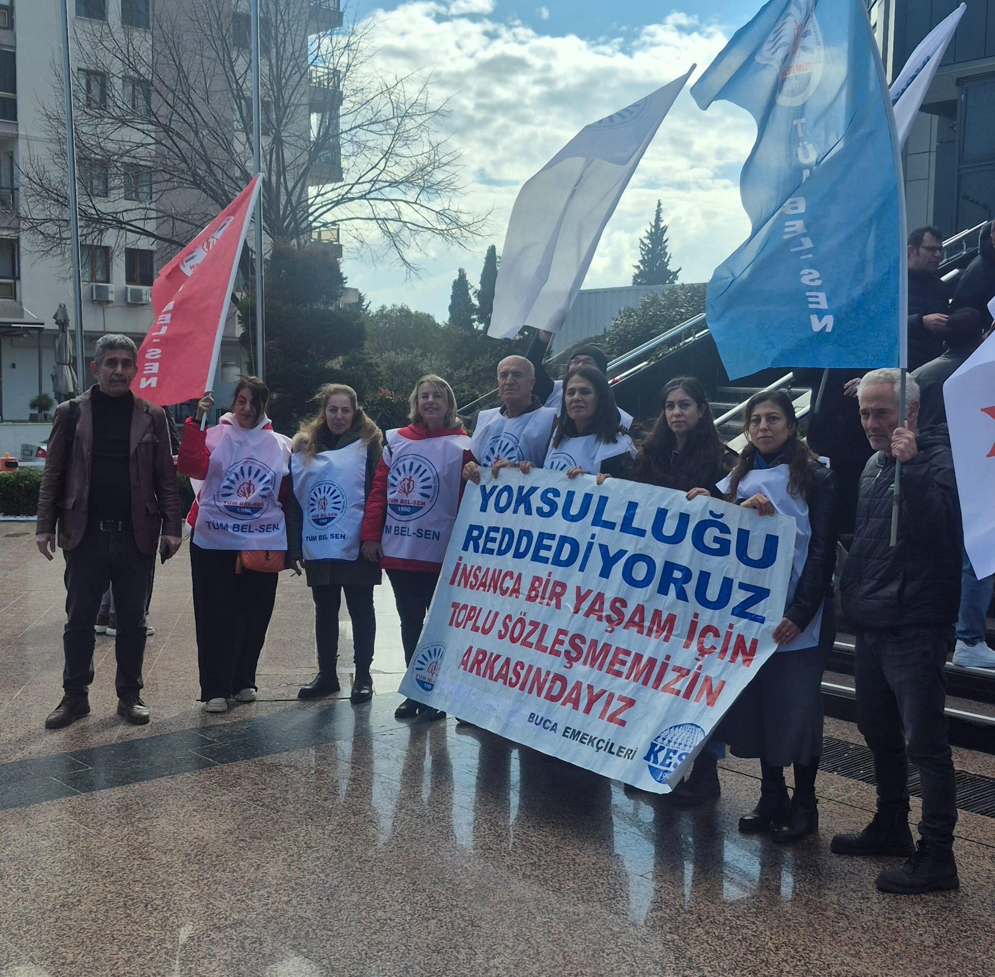 - Buca Belediyesi’nde aylardır sizin sözünüze güvenen, sağduyu içinde bekleyen, işini aksatmadan görevini yapan emekçilerin hakkını ödeyin; iş barışını bozmayın. Bugün iş bırakma eylemimiz, sendikal faaliyet kapsamında olup Anayasa, Danıştay ve AİHM içtihatlarıyla güvence altındadır.”