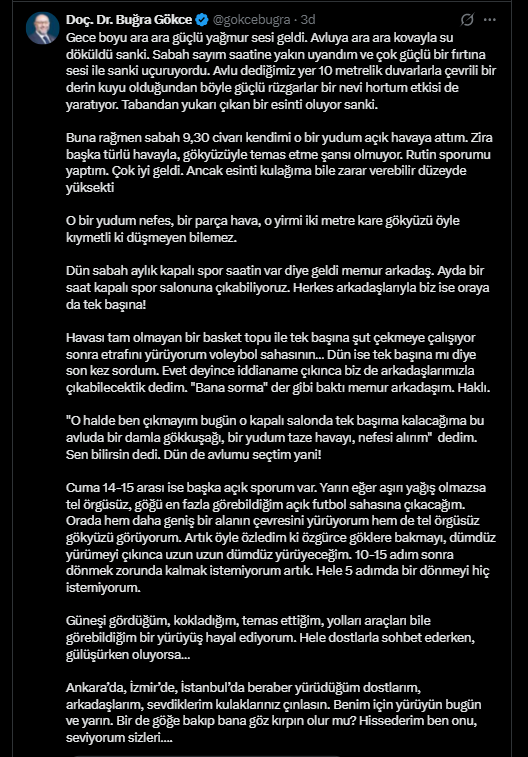 Silivri Cezaevi’nde tutuklu bulunan İzmir Büyükşehir Belediyesi’nin eski Genel Sekreteri ve İstanbul Planlama Ajansı’nın (İPA) Başkanı Doç. Dr. Buğra Gökce, sosyal medya hesabı aracılığıyla şu ifadeleri paylaştı: "Gece boyu ara ara güçlü yağmur sesi geldi. Avluya ara ara kovayla su döküldü sanki. Sabah sayım saatine yakın uyandım ve çok güçlü bir fırtına sesi ile sanki uçuruyordu. Avlu dediğimiz yer 10 metrelik duvarlarla çevrili bir derin kuyu olduğundan böyle güçlü rüzgarlar bir nevi hortum etkisi de yaratıyor. Tabandan yukarı çıkan bir esinti oluyor sanki. Buna rağmen sabah 9,30 civarı kendimi o bir yudum açık havaya attım. Zira başka türlü havayla, gökyüzüyle temas etme şansı olmuyor. Rutin sporumu yaptım. Çok iyi geldi. Ancak esinti kulağıma bile zarar verebilir düzeyde yüksekti O bir yudum nefes, bir parça hava, o yirmi iki metre kare gökyüzü öyle kıymetli ki düşmeyen bilemez.