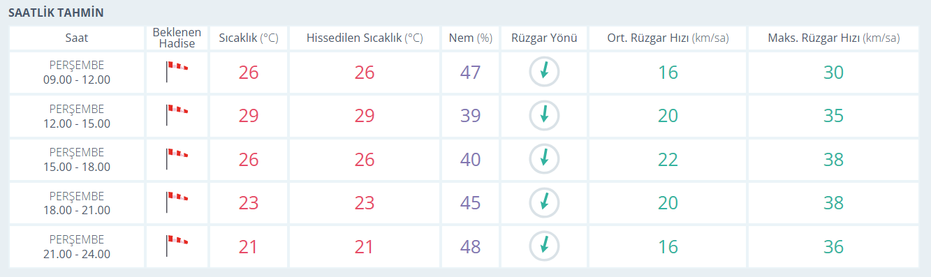 Meteoroloji raporuna göre İzmir’de önümüzdeki günlerde sıcaklıklar 29-31 derece arasında olacak. 18 Eylül Perşembe günü sıcaklık 28 derece ölçülürken, 19 Eylül Cuma günü 29 derece olacak. Hafta sonu sıcaklıklar ise 30 ila 32 derece arasında seyredecek. Bugün için meteroloji İzmir'e saat saat rüzgar uyarısında bulundu;
