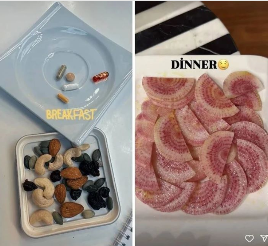 Çağla Şıkel, daha önce de kahvaltıda yediği kuruyemişler ve akşam yemeğinde yediği turp ile de gündeme gelmişti.