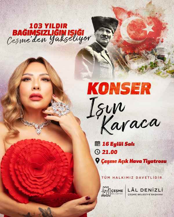 16 Eylül Salı günü ise kutlamalar devam edecek. Salı günü Işın Karaca, Çeşme'de kurtuluş coşkusu yaratacak. Konser Çeşme Açık Hava Tiyatrosu'nda yapılacak. Saati ise 21.00 olarak açıklandı.