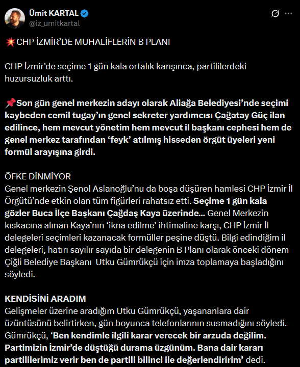 CHP İzmir’de yaklaşan il kongresi öncesi parti içerisindeki huzursuzluk giderek artıyor. Genel merkezin, Aliağa Belediyesi’nde seçimi kaybeden Cemil Tugay’ın genel sekreter yardımcısı olarak Çağatay Güç’ü aday göstermesi, mevcut yönetim ve il başkanlığı cephesinde rahatsızlık yarattı. İz Gazete Genel Yayın Yönetmeni Ümit Kartal, sosyal medya hesabından dikkat çeken bir paylaşım yaptı. Parti tabanında ‘feyk’ atıldığı hissiyle başlayan huzursuzluk, kongreye 1 gün kala muhaliflerin önceki dönem Çiğli Belediye Başkanı Utku Gümrükçü için imza toplamaya başlamasıyla yeni bir boyut kazandı. Utku Gümrükçü ise gelişmeler karşısında üzüntüsünü dile getirirken, kararın partililere ait olduğunu vurguladı.
