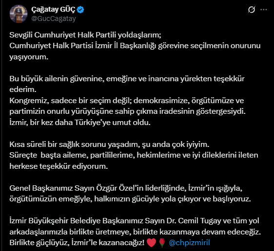 şu anda çok iyiyim. Süreçte başta aileme, partililerime, hekimlerime ve iyi dileklerini ileten herkese teşekkür ediyorum. Genel Başkanımız Sayın Özgür Özel’in liderliğinde, İzmir’in ışığıyla, örgütümüzün emeğiyle, halkımızın gücüyle yola çıkıyor ve başlıyoruz. İzmir Büyükşehir Belediye Başkanımız Sayın Dr. Cemil Tugay ve tüm yol arkadaşlarımızla birlikte üretmeye, birlikte kazanmaya devam edeceğiz. Birlikte güçlüyüz, İzmir’le kazanacağız!"