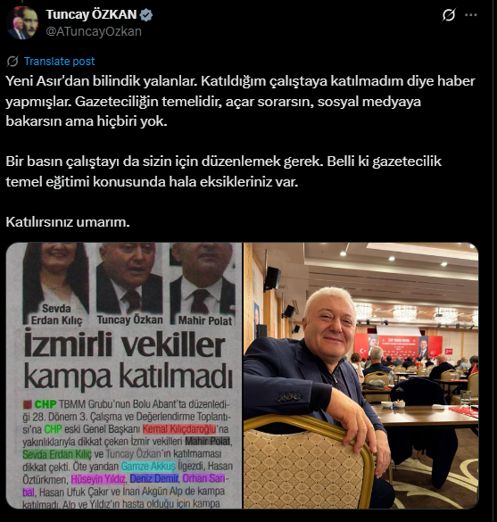 Ancak Yeni Asır Gazetesi “İzmirli vekiller kampa katılmadı” başlığıyla yayınladığı haberlerinde CHP İzmir Milletvekili Tuncay Özkan’ın da bu vekiller arasında olduğunu belirtti. CHP İzmir Milletvekili Tuncay Özkan bu habere sosyal medya hesabı üzerinden "Yeni Asır'dan bilindik yalanlar. Katıldığım çalıştaya katılmadım diye haber yapmışlar. Gazeteciliğin temelidir, açar sorarsın, sosyal medyaya bakarsın ama hiçbiri yok" ifadeleriyle sert yanıt verdi.