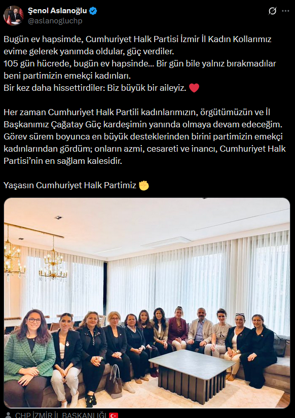 "Bugün ev hapsimde, Cumhuriyet Halk Partisi İzmir İl Kadın Kollarımız evime gelerek yanımda oldular, güç verdiler. 105 gün hücrede, bugün ev hapsinde… Bir gün bile yalnız bırakmadılar beni partimizin emekçi kadınları. Bir kez daha hissettirdiler: Biz büyük bir aileyiz.