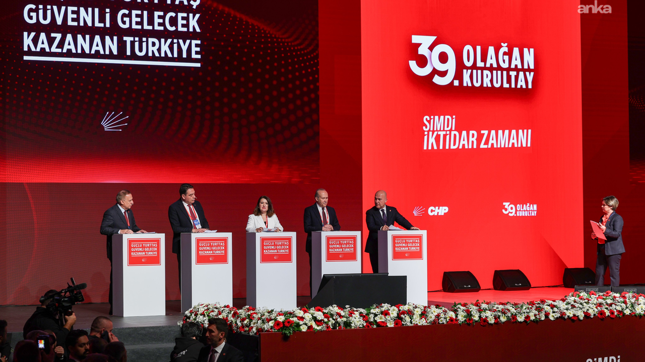 CHP’nin üç gün sürecek “Şimdi İktidar Zamanı” sloganlı 39’uncu Olağan Kurultayı bugün başladı. İlk günü seyircisiz olarak yapılan kurultayda salonda “İmamoğlu’na özgürlük”, “Umut burada, iktidar yolunda”, “Kurtuluş yok tek başına, ya hep beraber ya hiçbirimiz”, “Özgür Türkiye, özgür kadınlar”, “Var bir çaresi; Cumhuriyet Halk Partisi”, “Biz korkuyu evde bıraktık” ifadelerini yazılı olduğu pankartlar yerleştirildi. Ayrıca bu yıl hayatını kaybeden önceki Genel Başkan Altan Öymen’in fotoğrafının yer aldığı “Saygı ve minnetle” ve Manisa Büyükşehir Belediye Başkanı Ferdi Zeyrek’in fotoğrafının yer aldığı “Unutmayacağız” yazılı pankartlar da salonun iki köşesine yerleştirildi. Bunun yanında CHP’nin 15 tutuklu belediye başkanının fotoğrafının yer aldığı pankart da salona asıldı. Ayrıca Türkiye’nin 81 ilinden kadının el işiyle hazırlayıp Saraçhane’de İBB binasına astıkları “Önce adalet, önce hürriyet” yazılı pankart da salonda yerini aldı.