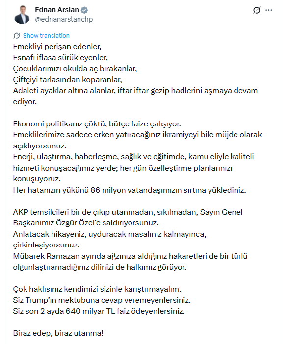 CHP İzmir Milletvekili ve PM üyesi Ednan Arslan sosyal medya hesabı X üzerinden şu paylaşımı yaptı: