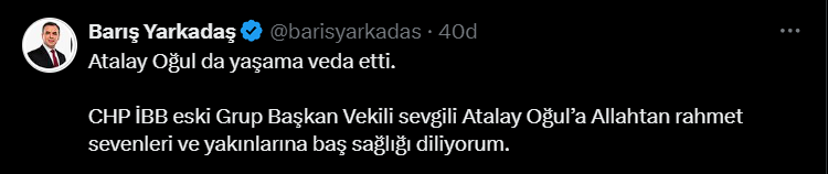 Gazeteci Barış Yarkadaş X hesabından yaptığı paylaşımda: "Atalay Oğul'da yaşama veda etti. CHP İBB Eski Grup Başkanvekili sevgili Atalay Oğul'a Allah'tan rahmet sevenleri ve yakınlarına başsağlığı diliyorum" dedi.