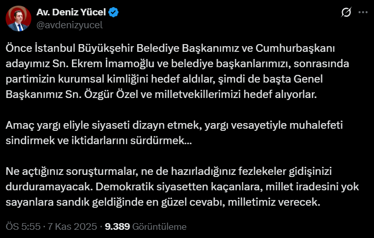 "Önce İstanbul Büyükşehir Belediye Başkanımız ve Cumhurbaşkanı adayımız Sn. Ekrem İmamoğlu ve belediye başkanlarımızı, sonrasında partimizin kurumsal kimliğini hedef aldılar, şimdi de başta Genel Başkanımız Sn. Özgür Özel ve milletvekillerimizi hedef alıyorlar. Amaç yargı eliyle siyaseti dizayn etmek, yargı vesayetiyle muhalefeti sindirmek ve iktidarlarını sürdürmek… Ne açtığınız soruşturmalar, ne de hazırladığınız fezlekeler gidişinizi durduramayacak. Demokratik siyasetten kaçanlara, millet iradesini yok sayanlara sandık geldiğinde en güzel cevabı, milletimiz verecek."