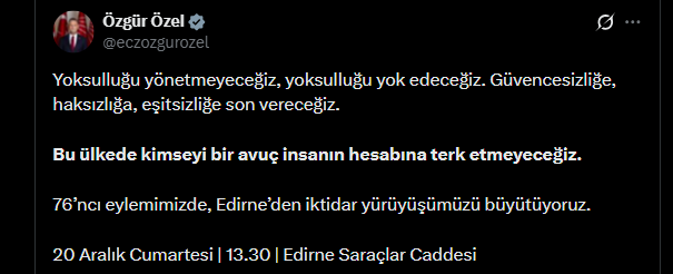 CHP Genel Başkanı Özgür Özel, sosyal medya üzerinden yaptığı açıklamada mitinge katılım çağrısı yaptı. Özel, mesajında şu ifadelere yer verdi: "Yoksulluğu yönetmeyeceğiz, yoksulluğu yok edeceğiz. Güvencesizliğe, haksızlığa, eşitsizliğe son vereceğiz. Bu ülkede kimseyi bir avuç insanın hesabına terk etmeyeceğiz. 76’ncı eylemimizde, Edirne’den iktidar yürüyüşümüzü büyütüyoruz. 20 Aralık Cumartesi | 13.30 | Edirne Saraçlar Caddesi"