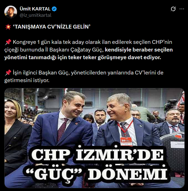 CHP’nin yeni İl Başkanı Çağatay Güç, kongreye sadece bir gün kala tek aday olarak seçilmesinin ardından, kendisiyle beraber göreve başlayan yönetim kurulu üyelerini tanımadığı için teker teker görüşmeye çağırdı. İz Gazete Genel Yayın Yönetmeni Ümit Kartal’ın paylaştığı kulis bilgisine göre, Güç bu görüşmelerde yöneticilerden yanlarında CV’lerini de getirmelerini istedi.