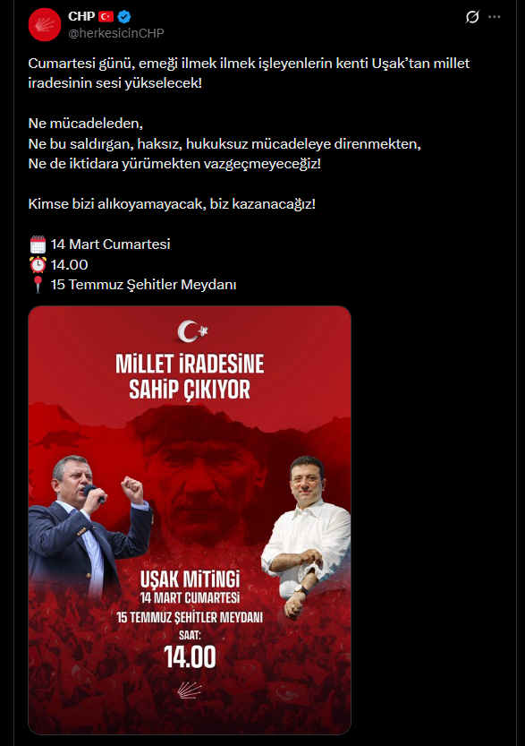 “Cumartesi günü ( 14 Mart Cumartesi - 14.00 - 15 Temmuz Şehitler Meydanı), emeği ilmek ilmek işleyenlerin kenti Uşak’tan millet iradesinin sesi yükselecek! Ne mücadeleden, Ne bu saldırgan, haksız, hukuksuz mücadeleye direnmekten, Ne de iktidara yürümekten vazgeçmeyeceğiz! Kimse bizi alıkoyamayacak, biz kazanacağız”
