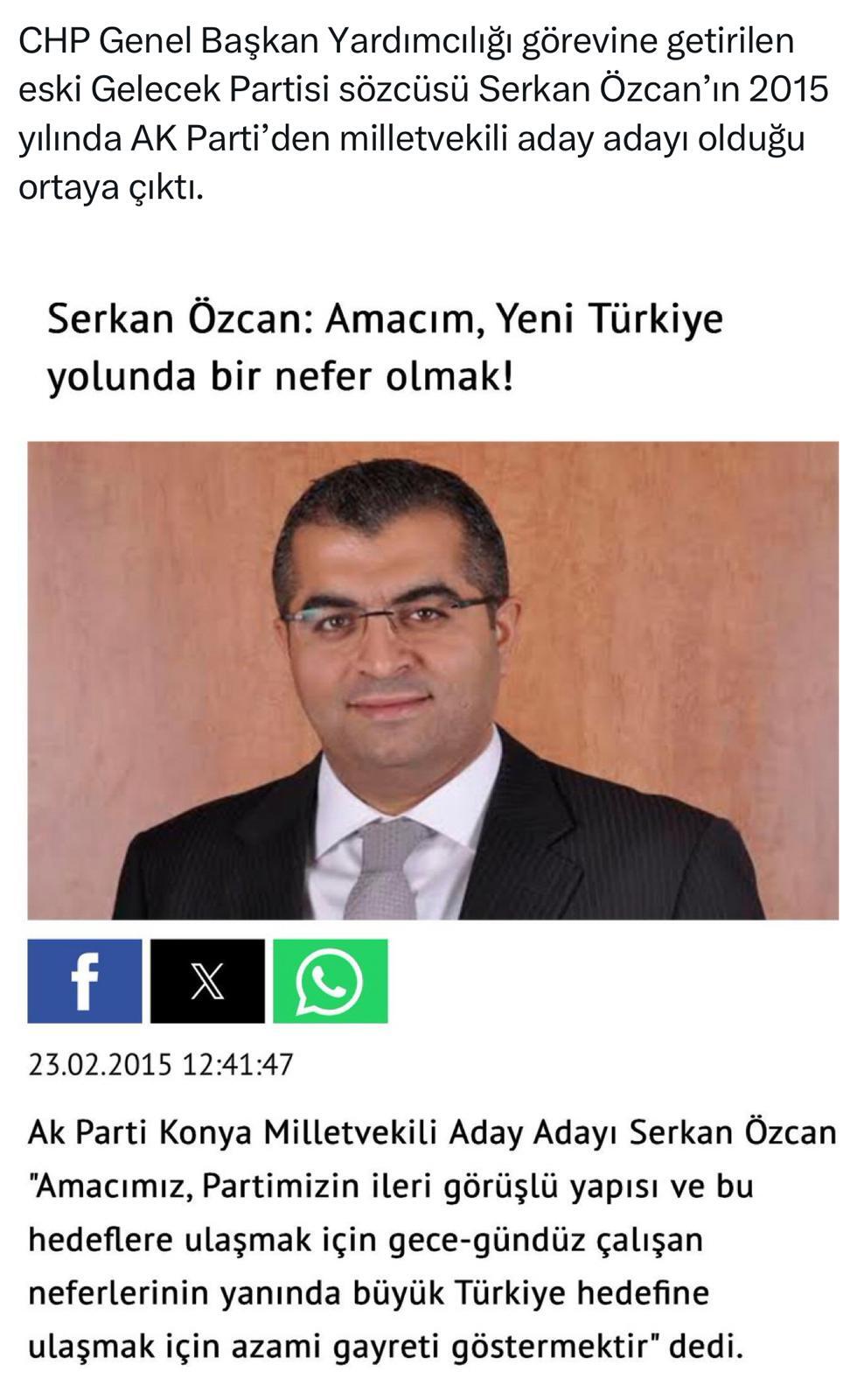 Bana mı kaldı Kemal Kılıçdaroğlu’nu savunmak? Kapısında yatanlar, günah keçisi olarak onu ilan ediyorlar. Kılıçdaroğlu, 39 milletvekilini sağa verdi. Bu adamlar şimdi, CHP üyesi olmakla kalmadılar, parti meclisi üyesi oldular, genel başkan yardımcısı oldular. Musa Çam’a yer yok, Atilla Sertel’e yer yok, Tacettin Bayır’a yer yok, Kamil Okyay Sındır’a yer yok. Serkan Özcan, genel başkan yardımcısı oldu. Gelecek Partisi’nin sözcüsüydü. 2015’te AKP’nin Konya milletvekili adayı.”